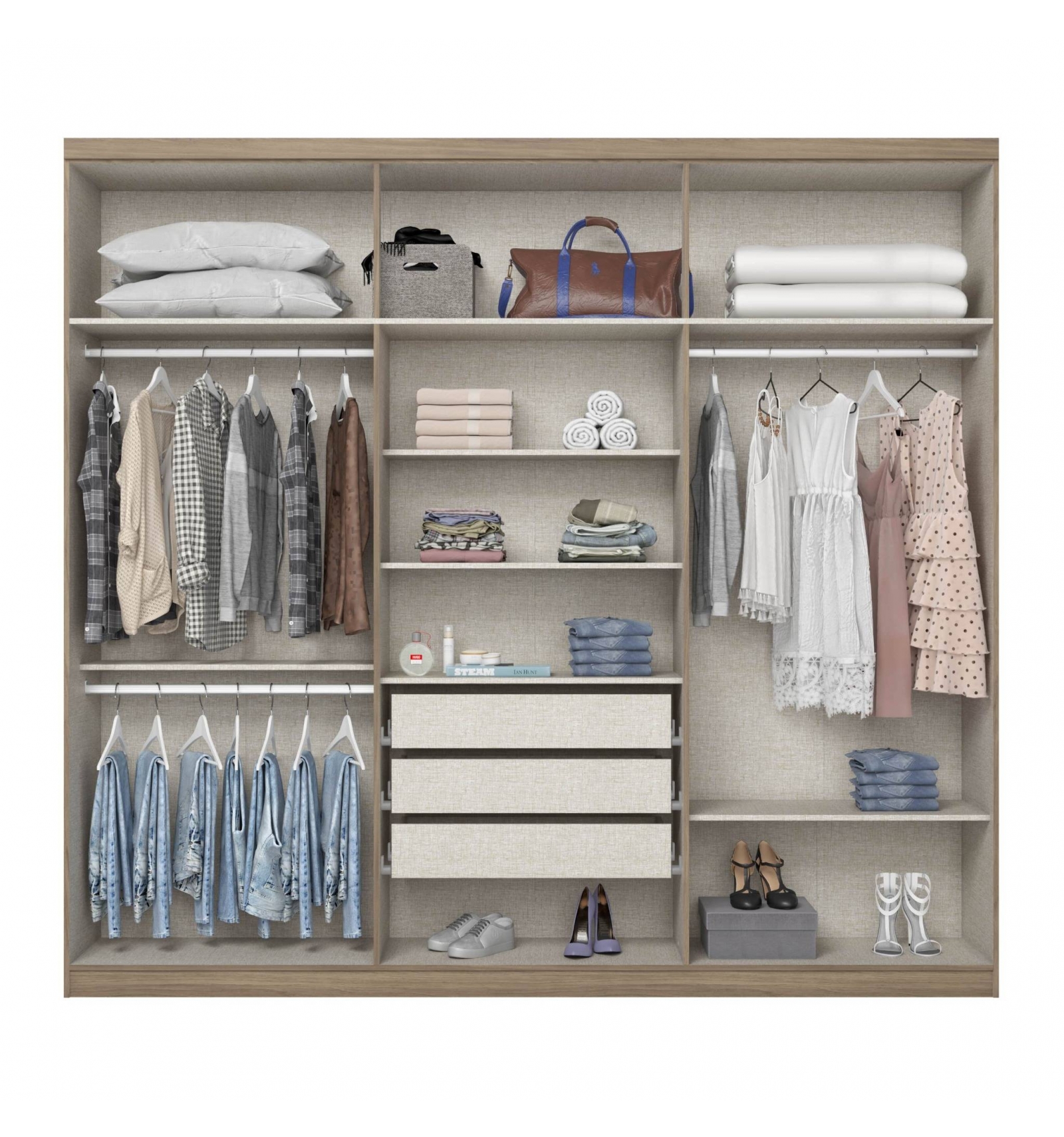 The Sirius Vicawu Wardrobe combines modern style, ample space and high-resistance materials. Its White / Oak finish brings brightness and warmth, creating a more harmonious, tidy and visually appealing bedroom.
