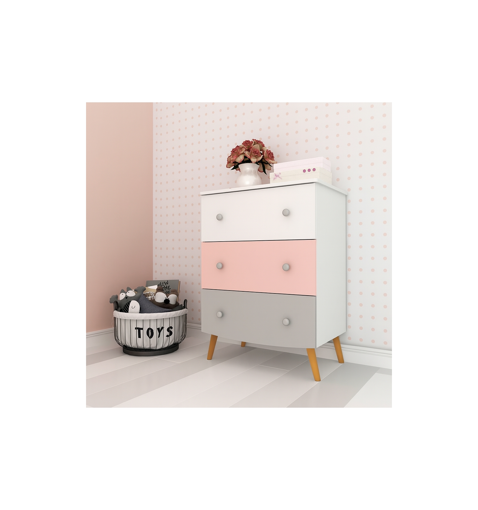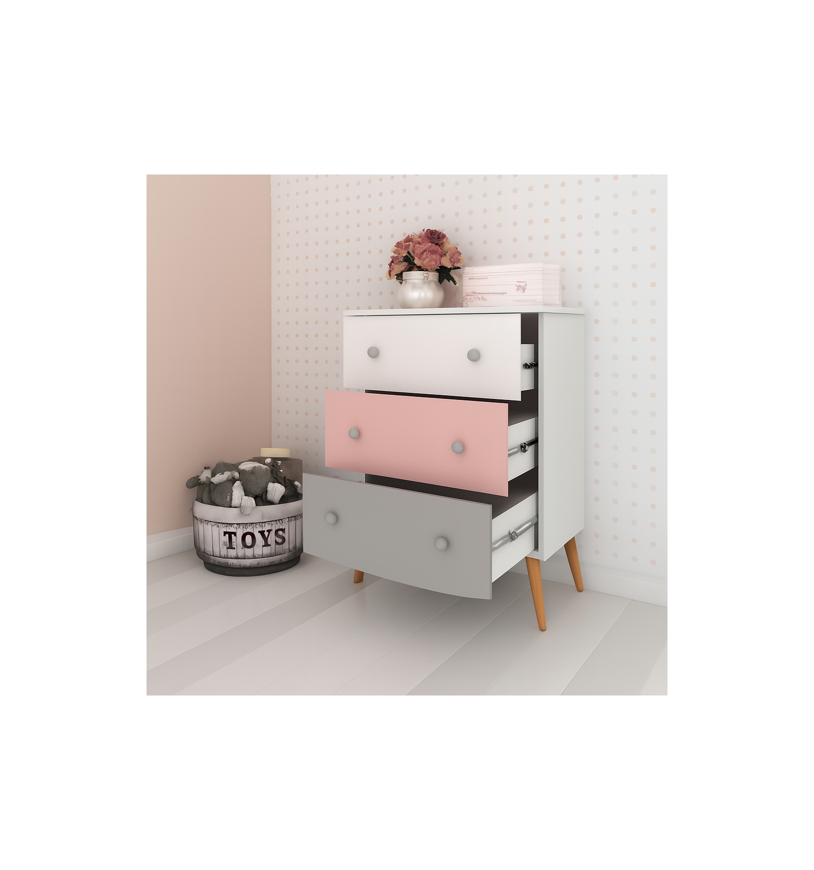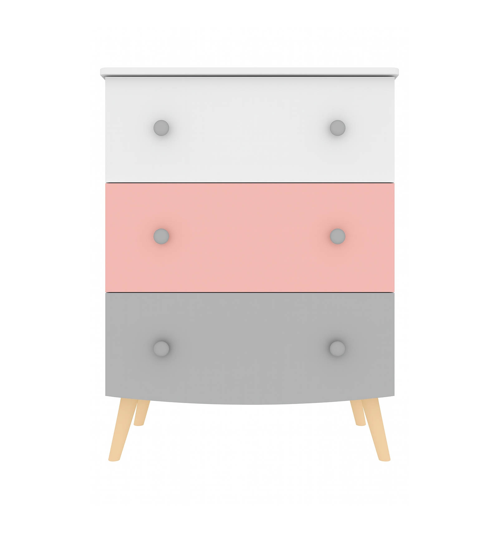 Its design combines white, pink, and grey colours, creating a soft and welcoming atmosphere, perfect for any child's bedroom. The round metallic-toned handles add a touch of elegance and simplicity, while the retro-style angled legs enhance its timeless and fresh aesthetic. This dresser, part of the Ringo collection, is designed to adapt to various décor styles, from modern to classic, ensuring a perfect balance of functionality and style.