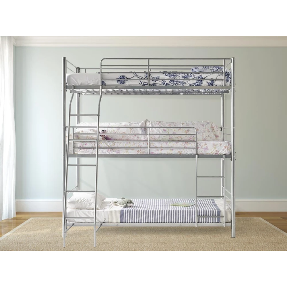 The KIKA triple bunk bed provides a stable metal structure for three children, perfect for small rooms. Upper beds feature guardrails and free up floor space for playing, studying, or additional furniture.